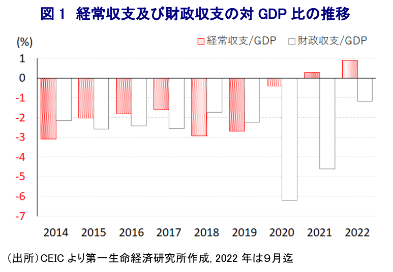 このところの国際金融市場においては、米ドル高の動きに一服感が出ていることを受けて、それまで資金流出に直面してきた経済のファンダメンタルズ(基礎的条件)の脆弱な国をはじめとする新興国を取り巻く状況は大きく変化している。インドネシアは慢性的に経常赤字と財政赤字の『双子の赤字』に加え、インフレも常態化するなど脆弱なファンダメンタルズを抱え、過去には国際金融市場が動揺する度に資金流出に見舞われてきた。さらに、コロナ禍対応を目的に同国政府、及び中銀は財政ファイナンスに動くなど財政状況は一段と悪化する事態となったものの、足下ではコロナ禍を克服するなど景気の底入れが進み歳入が想定を上回る推移をみせるなかで財政赤字幅は縮小している。また、商品市況の上振れによる交易条件の改善や輸出額の押し上げが進んだことで貿易収支は黒字基調で推移していることも追い風に、足下の経常収支は黒字となるなど対外収支も改善している。そして、年明け以降は原油や天然ガスなどエネルギー資源に加え、穀物などの国際価格の上振れを受けて食料品やエネルギーなど生活必需品を中心とするインフレ圧力が強まり、インフレ率は中銀の定めるインフレ目標を上回る推移が続いているほか、国際金融市場における米ドル高を受けた通貨ルピア安は輸入物価を押し上げて一段のインフレ昂進を招く事態に直面してきた。足下のインフレ率は商品高の動きに一服感が出ていることを受けて頭打ちの兆しがうかがえるほか、上述のように国際金融市場における米ドル高に一服感が出ていることもルピア安圧力の後退を通じてインフレ鈍化に資することが期待される。