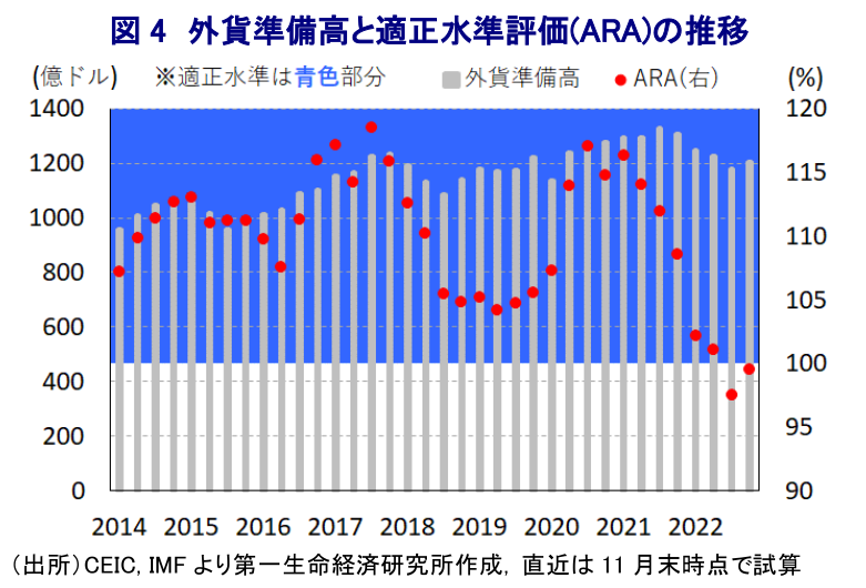 このように足下のインドネシア経済のファンダメンタルズは改善する動きがみられるものの、米ドル高に一服感が出ているにも拘らずルピアの対ドル相場は上値の重い推移が続いており、周辺のアジア新興国通貨は比較的強含みする動きをみせているのと対照的な状況が続いている。なお、中銀は物価、及び為替の安定を目的に8月に約4年ぶりの利上げ実施に動くとともに、先月の定例会合でも4会合連続の利上げ、且つ3会合連続の大幅利上げを決定するなどタカ派傾斜を強めてきた(注1)。一方、同国では相次いで法改正が実施されており、改正刑法では言論の自由やプライバシー、人権侵害に繋がるほか、改正中銀法では中銀の独立性に対する懸念に加え、財政ファイナンス実施のハードルが低下するなどの懸念が高まっている(注2)。一連の動きは足下のルピア相場の足かせになっているほか、主要株価指数(ジャカルタ総合指数)の上値が同様に抑えられる一因になっているとみられるなど、2024年の次期大統領選、及び総選挙に向けて民族と宗教を意識した政治の動きに足を引っ張られている。こうしたなか、中銀は22日に開催した定例会合において政策金利である7日物リバースレポ金利を5会合連続で引き上げる一方、利上げ幅を4会合ぶりに25bpに縮小させて5.50%とする決定を行い、米FRB(連邦準備制度理事会)が直近のFOMC(連邦公開市場委員会)において利上げ幅を縮小させたことに歩を併せる対応をみせている。会合後に公表した声明文では、今回の決定について引き続き「コアインフレ率を目標域に収めるべく、慎重で前倒し、且つ先手を取った前向きな対応」とした上で、「輸入インフレ回避を目的にルピア相場の安定化策も強化する」との考えを示した。その上で、世界経済について「減速が見込まれる」としつつ、国際金融市場に関連して「米FRBは来年も利上げを続けると見込まれる」との見方を示した。一方、同国経済について「堅調さが続く」として「今年の経済成長率は+4.5~5.3%の上限近傍、来年は+4.5~5.3%の中央付近となる」との見通しを示した。また、足下で改善が続く経常収支について「今年はGDP比+0.4~1.2%の黒字となり、来年も同▲0.4~+0.4%に収まる」とした上で、通貨ルピア相場について「足下ではファンダメンタルズやインフレ抑制に向けた取り組みを反映して調整圧力が後退している」として「コアインフレ率を目標域に収めるべく政策調整の強化を維持する」との考えを示した。また、政策調整に関連して「これまで示唆してきたように金融政策は安定を重視。その一方、その他の政策は景気を重視した対応になる」とした上で、特定の分野に対する貸出促進を目的に銀行に対する預金準備率に関してインセンティブを設ける方針を明らかにするなど、金融引き締めを進める一方で景気下支えにも注力する姿勢を示している。なお、米ドル高の一服による資金回帰の動きを反映して減少基調が続いた外貨準備高は11月には増加に転じているものの、IMF(国際通貨基金)が示す国際金融市場の動揺への耐性の有無を示す適正水準評価(ARA:Assessing Reserve Adequacy)に照らすと11月末時点でも「適正水準(100~150%)」をわずかに下回るなど、依然として心許ない状況は変わらない。足下のルピア相場が上値の重い展開が続いていることを勘案すれば、外貨準備高は順調に増加しているとは見通しにくく、国際金融市場の動揺への耐性は充分とは言いがたい状況にある。中国におけるコロナ規制の転換による商品高への期待など同国経済の追い風になる材料はうかがえるものの、上述の法改正の動きなど不安材料もくすぶるなかで、先行きも引き続き難しい政策対応を迫られる局面が続くことが予想される。
