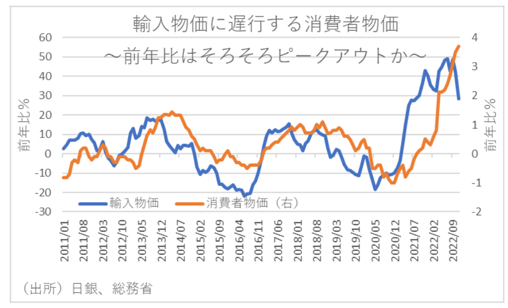 しかし、2023年を展望すれば、既にエネルギー価格の上昇はピークアウトしていることから、特に2月分以降の消費者物価の伸び率も鈍化の可能性が高いだろう。というのも、足元ではエネルギー価格の元となる原油価格が130㌦/バレル超えから70㌦/バレル台まで下がっており、既にガソリン価格の値下がりに結び付いている。また、総合経済対策による電気・ガス代の価格抑制策の影響が2月分から反映されるためである。