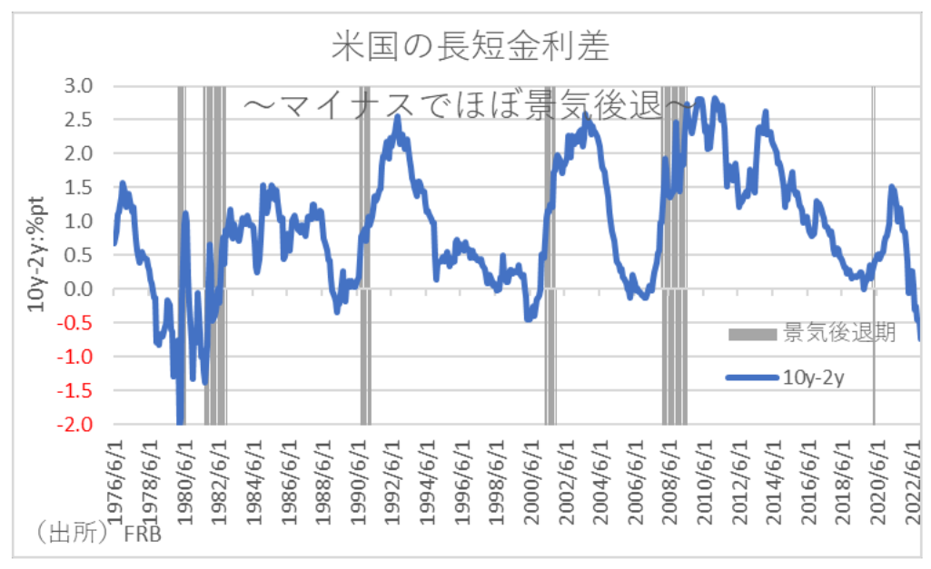 しかし、これまでの物価上昇の主因となってきたドル高も2023年以降はもう一段の円高に向かいそうである。というのも、既に米国経済はこれまでの金利上昇などの影響を受けて明確に減速している。そして米国では逆イールド、すなわち2年債利回りが10年債利回りを上回るとその後必ず景気後退局面するという経験則があるが、すでに今年の夏時点でこの状況にあることからすれば、2023年の米国経済はさらに減速の度合いが強まることが予想される。