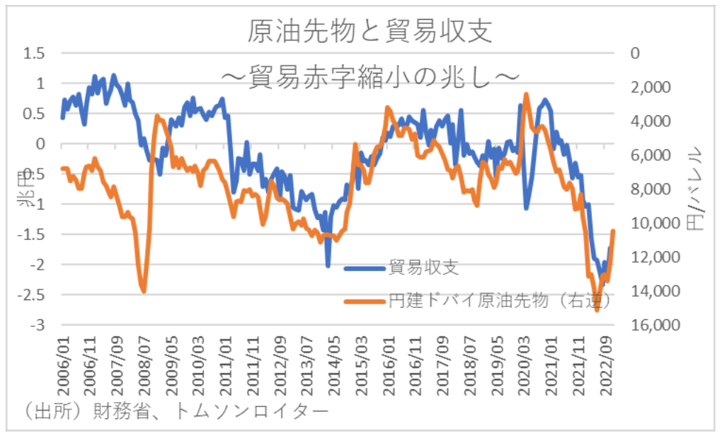 一方、円安の要因となっていた日本の経常黒字の縮小も、輸入一次産品価格が円安の進行以上に下落していることからすれば、日本の貿易赤字も縮小に向かおう。さらに、サービス収支の赤字も今後の水際対策の緩和に伴うインバウンド消費の増加などにより縮小に向かう等から、経常収支の黒字が拡大に転じることが2023年の円高要因となろう。