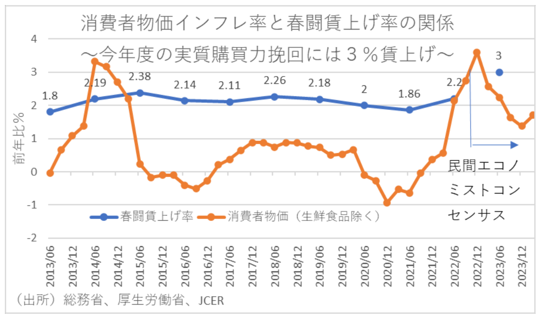 持続的なインフレ率の維持にはディマンドプルインフレが必要であるが、この年の世界経済は一段と減速が強まる可能性が高く、そもそも日本は海外と異なり需要不足である。このため、来年以降はコストプッシュインフレ圧力の低下により日本のインフレ率は低下に転じ、コアCPIのインフレ率も+1%台まで下がるとエコノミストはみている。