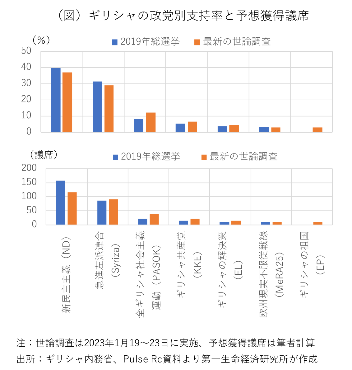 政党別の支持率調査によれば、現与党のNDが30%台後半でリードを保っており、ギリシャ危機の最中に反緊縮を唱えて政権を奪取し、トロイカ(EU、IMF、ECBの支援団の総称)と対立したシリザが20%台後半でこれを追い、かつて二大政党の一角を占めた全ギリシャ社会主義運動(PASOK)が10%台前半で3番手に付けている(図)。定数300のギリシャ議会は従来、250議席が3%以上の票を獲得した政党に比例配分され、最多票を獲得した政党に残りの50のボーナス議席が割り振られた。だが、2015年に政権を奪取したシリザは、ボーナス議席を廃止し、全議席が比例配分される形に選挙制度を改めた。2019年に政権を奪還したNDは、ボーナス議席を再導入したが、即時効力発生に必要な3分の2以上の賛成票が得られなかったため、新たな選挙制度は次の次の総選挙から適用され、今回はボーナス議席なしの選挙制度が適用される。