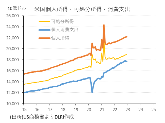 個人消費支出を支えるのは個人所得、可処分所得の動きだ。アメリカ商務省のデータは季節調整済年率換算値であるが、2015年以降も順調に拡大してきたが、2020年のCovid-19パンデミックで厳しい行動制限を伴う感染対策がとられたこともあり個人消費支出は大きく下方屈折。2021年に入りそれまでのトレンドに回帰、その後は物価上昇もありトレンドを大きく上回る支出が続いている。個人所得はCovid-19パンデミック対策の数次にわたる大規模経済対策での給付金支給、失業手当の拡充等から特に2020年4月、5月、(トランプ政権による2.2超ドルの経済対策)2021年3月、4月(バイデン政権による1.9兆ドルの経済対策)にかけて大きくトレンドを上回る所得となっており、合わせて可処分所得も大きく上振れしていた。