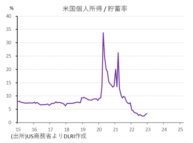 これだけ大きな超過貯蓄もさすがにこのインフレのなかで貯蓄率の低下が示すように取り崩しが進んでいるものの2022年末でも1兆ドル近くはあると思われる。引き続き実質消費を支えるには十分な規模感だろう。インフレも“物”についてはエネルギー価格の落ち着き、巣ごもり消費の反動(在庫調整)、サプライチェーンの正常化、により低下が見えてきているものの、“サービス”についてはコロナ禍からの経済正常化で需要が戻ってきているところに、超過貯蓄の下支えもあり価格上昇圧力は強い環境が続くリスクを考えておいた方が良いだろう。市場ではインフレピークアウトでFRBの早期の利上げ停止を予想するむきは多いがここで楽観論に傾くのは早計だろう。