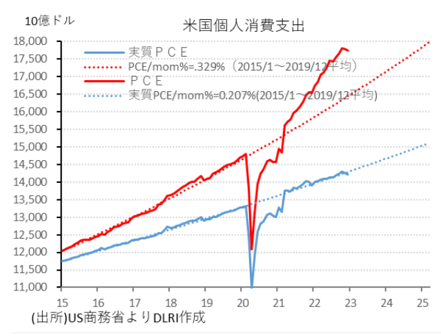 小売売上高は字のごとく基本“物”の売上高統計である。ご存じの通りアメリカの個人消費はサービス消費のウェイトが大きく、“物”が34%程度、“サービス”が66%程度となっている(2022年)ため消費全体を見るには個人消費支出データを見る必要がある。