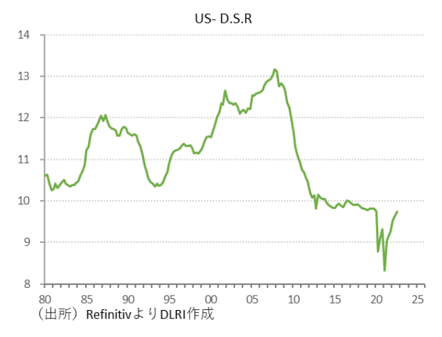 この住宅バブル期以来の貯蓄率低下を支えているものはなんだろうか?住宅バブルの頃は積極的に借入を行っていた時期でもありDSR(デッド・サービス・レシオ)は2007年4Qには13.17まで上昇、その後リーマンショックを経て10倍割れまで低下した後は比較的安定して動きとなっている。足元ではクレジットカード中心に債務残高が拡大する動きもみられるが所得のレベルからすればそれほど大きなものではないし、DSRは2022年3Qで9.75と2021年1Qの8.33から上昇しているがパンデミック前に戻っただけとも言えるし問題になるようなものではないだろう。もちろん金利上昇の中で債務残高が拡大していくことには注意が必要だ。