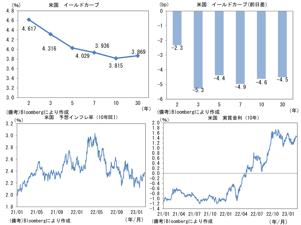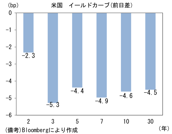 - 米金利はカーブ全般で金利低下。債券市場の予想インフレ率(10年BEI)は2.367%(▲1.1bp)へと低下。実質金利は1.448%(▲3.4bp)へと低下。