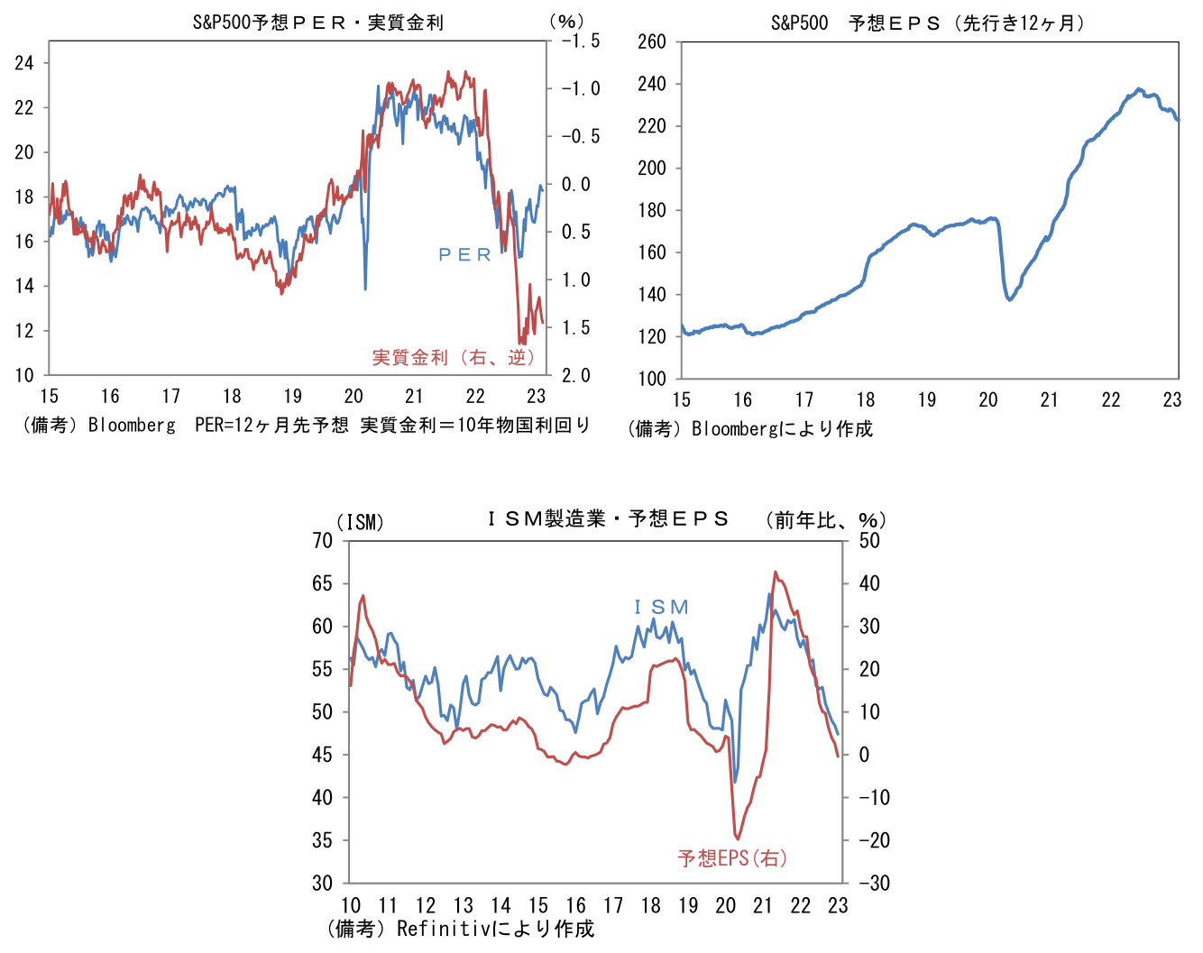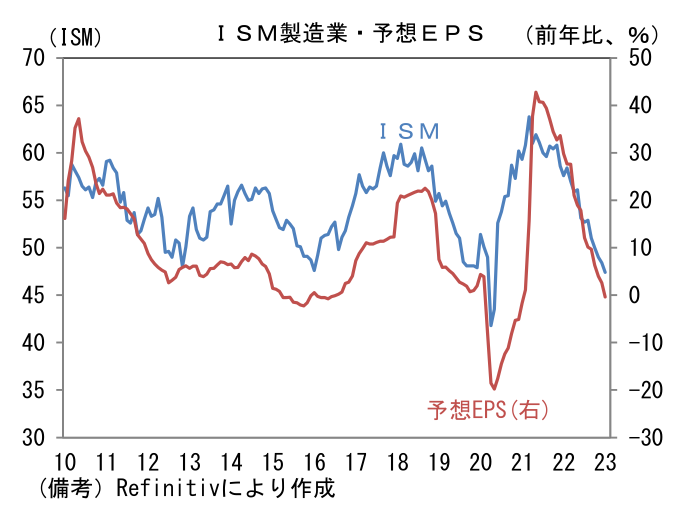 今後、株価が調整を免れるにはノーランディング(景気再加速)、すなわち予想EPSの反転上昇が条件になるだろう。その点、企業収益を推し量る上で有用なISM製造業など企業サーベイに注目したい。現在のISM製造業は47.4と、リーマンショック以降3度しか経験していない領域に落ち込んでいる。過去の循環がそのまま当てはまるのであるであれば、向こう数ヶ月の内に底打ちが期待されるが、今回に限っては金融引き締めが続いている上、コロナ禍における財需要の先食いなど特殊要因もあり先行き不透明感が強い。利上げが終わり、景気の逆風が止むならば消費・生産活動が本格的に復調しISM製造業が上昇局面入りする可能性は高まるが、インフレが終息しない以上それは難しいのではないか。