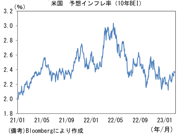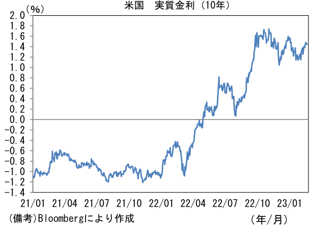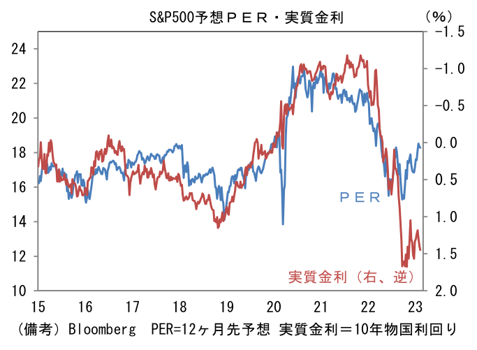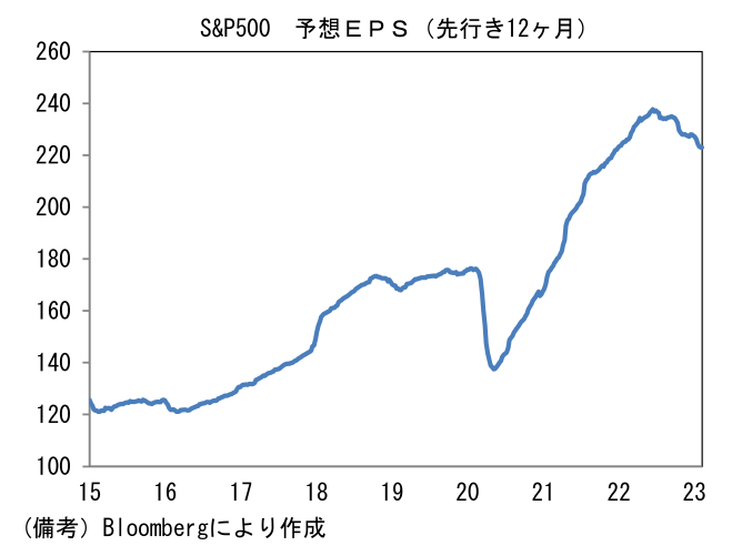 この間、株価は持ち堪えておりS&P500は4000超(17日終値:4079.1)を維持している。Fedの引き締め警戒とノーランディング期待が交錯し、「長期金利上昇→株価下落」という単純な図式ではなくなりつつある。それでも実質金利とPERの乖離がここへ来て一段と大きくなっていることには注意したい。無論、PERと実質金利に絶対的な関係は成立しないのだが、予想EPSが下向き基調にある中、株価が水準を切り上げたことで、結果的にPERは実質金利で説明の付かない水準へと上昇している。