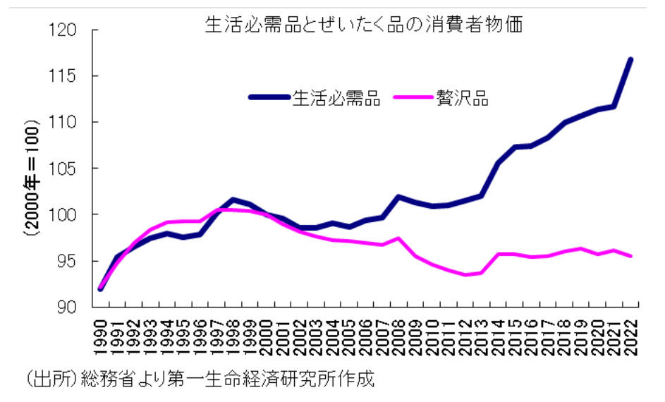 まず、CPIを生活必需品(食料、持家の帰属家賃を除く家賃、光熱水道、被服履物、交通、保健医療)と贅沢品(生活必需品以外)に分類し、その動向を比較してみると、2022年は贅沢品の価格が低下する一方で、生活必需品の価格が急上昇していることがわかる。