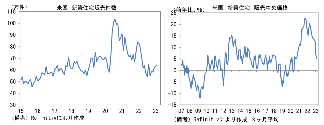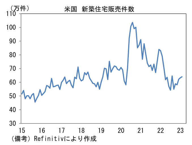 - 2月米新築住宅販売件数は前月比+1.1%、64.0万件と市場予想(650万件)に概ね一致。前月分は大幅に下方修正されたが、3ヶ月平均でみると基調は上向いており底打ち気配が強まっている。販売中央価格は前年比+2.5%へと鈍化した(3ヶ月平均では+5.3%)。