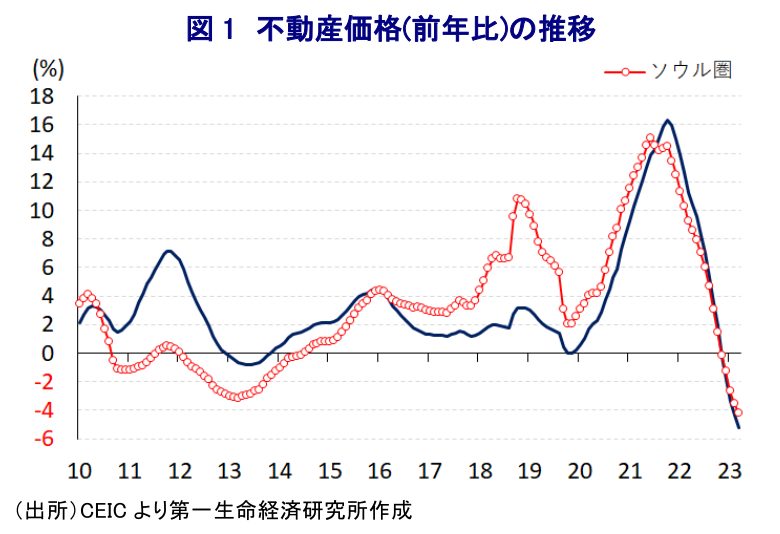 - 韓国経済はコロナ禍からの景気回復が進んだが、商品高やウォン安がインフレ昂進を招いたほか、不動産市況のバブル懸念も重なり、中銀は断続的、且つ大幅利上げを余儀なくされた。足下のインフレ率は頭打ちするも依然高止まりする一方、不動産市況は調整が続いており、家計部門には逆資産効果に加えて物価高と金利高の共存が足かせとなる状況が続く。世界経済の減速懸念が外需の足かせとなるなか、若年層や働き盛り世代を中心に雇用環境は厳しい状況が続くなど、家計部門を取り巻く状況には不透明感が高まる。