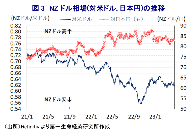 ニュージーランド経済を巡っては、感染一服を受けた経済活動の正常化の進展に加え、欧米など主要国を中心とする世界経済の回復を追い風に、内・外需双方で景気は底入れの動きを強めるなどコロナ禍の克服が進んできた。ただし、昨年来の商品高を受けた食料品やエネルギーなど生活必需品を中心とする物価上昇に加え、景気回復に伴う雇用改善の動きは賃金上昇圧力に繋がるとともに、国際金融市場における米ドル高を受けた通貨NZドル安は輸入インフレを招くなど、幅広くインフレ圧力が強まる事態に直面している。また、中銀(NZ準備銀行)はコロナ禍対応を目的に利下げ、量的緩和など異例の金融緩和に舵を切ったものの、幅広いインフレの顕在化に加え、コロナ禍を受けた生活様式の変化や景気回復による不動産需要の拡大を追い風に不動産市況は急騰するなどバブルが懸念される事態となった。よって、中銀は一昨年後半に金融政策の正常化に動くとともに、一昨年10月に7年強ぶりの利上げを実施し、その後も物価と為替の安定を目的に断続的、且つ大幅利上げに動く対応を迫られる展開が続いた。ただし、インフレ率は昨年半ばをピークに頭打ちに転じるも依然として中銀の定めるインフレ目標(1~3%)を大きく上回る推移が続いており、物価高と金利高の共存が長期化するなかで急騰した不動産市況も一転調整の動きを強めるなど、景気に冷や水を浴びせる懸念が高まっている。昨年10-12月の実質GDP成長率は前期比年率▲2.46%と3四半期ぶりのマイナス成長に転じているほか(注1)、年明け以降も1月に最大都市オークランドが記録的豪雨に直面するとともに、翌2月もサイクロンの接近により大規模な洪水や土砂崩れ、高波が直撃しており、同国政府は一連の被害額が2011年の同国南島クライストチャーチでの大地震(135億NZドル(GDP比3.6%))を上回る可能性を示唆するなど、景気に一段と下押し圧力が掛かる懸念が高まっている。こうした状況にも拘らず、中銀は今月の定例会合においても11会合連続の利上げに加え、利上げ幅も50bpとする大幅利上げの実施を決定しており、これに伴い政策金利(OCR)は5.25%と世界金融危機直後以来となる高水準となるなど『タカ派』姿勢を維持している(注2)。その上で、先行きについても景気鈍化が避けられないとの認識を示しつつ物価抑制を重視する考えをみせるなど、一段の金融引き締めに動く可能性に含みを持たせる姿勢をみせた。こうしたことから、これまでの断続利上げによる物価動向への影響に注目が集まるなか、1-3月のインフレ率は前年同期比+6.7%と前期(同+7.2%)から鈍化して4四半期ぶりに7%を下回る伸びとなっているほか、コアインフレ率も同+6.7%と前期(同+6.7%)から丸2年ぶりに伸びが鈍化するなど頭打ちの兆候が出ている。ただし、インフレ率、コアインフレ率ともに中銀目標を大きく上回る推移が続いている上、食料品やエネルギーなど生活必需品を中心にインフレ圧力がくすぶる状況のみならず、サービスや住宅建設関連など幅広い分野で物価上昇の動きが続いていることが確認されている。上述のように中銀はタカ派姿勢を維持する展開をみせているにも拘らず、足下についてはインフレ鎮静化にはほど遠い状況にあると捉えられる。よって、金融市場においては中銀が来月末に予定される次回会合においても追加利上げに動くとの観測が強まる一方、一段の景気減速が避けられなくなっており、利上げ局面の終了は着実に近付きつつある。先月以降は米ドル高の動きに一服感が出ているものの、通貨NZドル相場については中銀によるタカ派姿勢にも拘らず利上げ局面の終了が近付いているとの見方を反映して上値が抑えられる展開が続いている。その意味では、当面のNZドル相場については中銀によるタカ派姿勢が意識される状況にも拘らず、引き続き方向感の乏しい展開が続く可能性が高いと判断出来る。