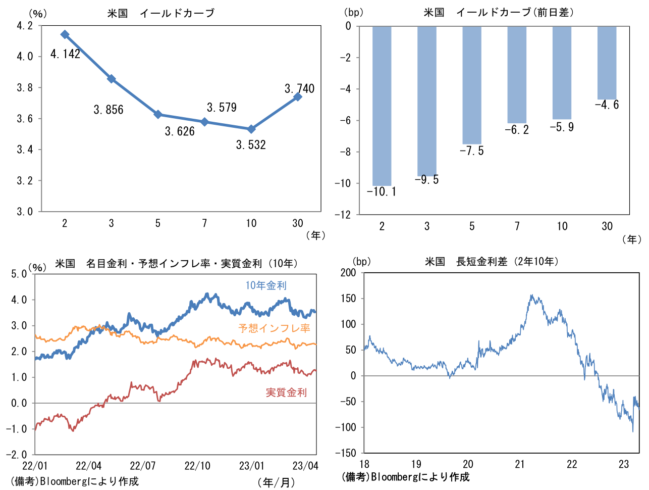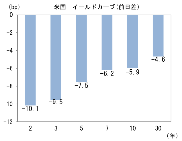 - 米金利はベア・フラット化。予想インフレ率(10年BEI)は2.273%(▲1.6bp)へと低下。実質金利は1.256%(▲4.1bp)へと低下。長短金利差(2年10年)は▲61.5bpへとマイナス幅縮小。
