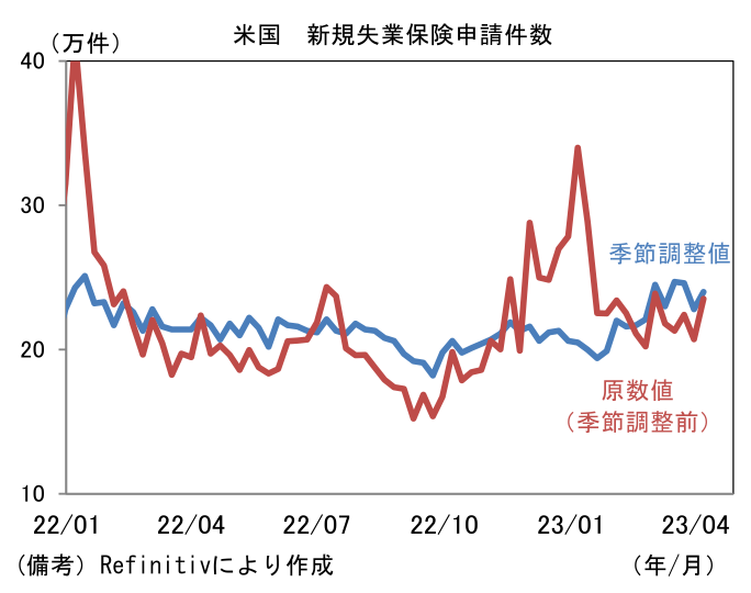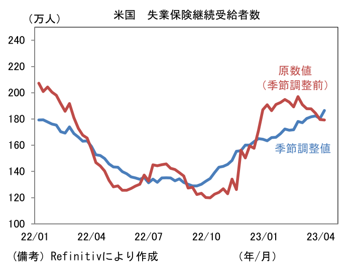 - そうした慎重姿勢が強まる中で、企業が徐々に雇用を削減しつつある様子が窺える。新規失業保険申請件数は24.5万件と前週比増加。深刻な人手不足を背景に低水準を維持しているとはいえ、20万件割れが常態化していた2022年後半の水準からは徐々に切り上がっている。この間、失業保険の継続受給者数も増加基調にあり、「人手不足」と「解雇増」が併存する歪な構図となっている。雇用統計や求人統計を見る限り全体としてみれば、依然、労働者優位の構図にあるとみられるが、資金繰り環境が悪化する中で、高止まりする人件費を許容できない企業が増加している可能性が浮かび上がる。実際、NFIB中小企業調査では人件費や雇用の計画を示す系列が低下基調にあり、企業の採用意欲が減衰している様子が窺える。現時点における労働市場の冷え込みはインフレ沈静化の代償として「やむなし」といった程度であるが、年後半に向けて労働市場が急速に悪化する可能性には引き続き警戒が必要だろう。