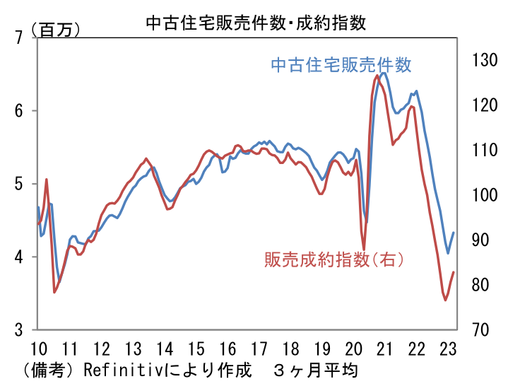 - 3月米中古住宅販売販売件数は前月比▲2.4%、444万件であった。物件価格高騰、住宅ローン金利高止まりを背景に販売件数は大幅に落ち込んだ状態にある。3ヶ月平均値は1月を底に緩やかな回復基調にあるが、パンデミック前の水準(約500万件)には程遠い。