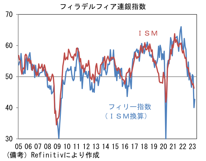 4月フィラデルフィア連銀製造業景況指数は▲31.3とリーマンショック時に匹敵する弱さが続き、ISM製造業景況指数のウェイトを用いてISM換算した数値も42.7と弱かった。ISM換算値は3月から2.6pt改善したとはいえ、生産活動の急激な落ち込みを映じている。今回の結果は3月底説に疑問を呈する。