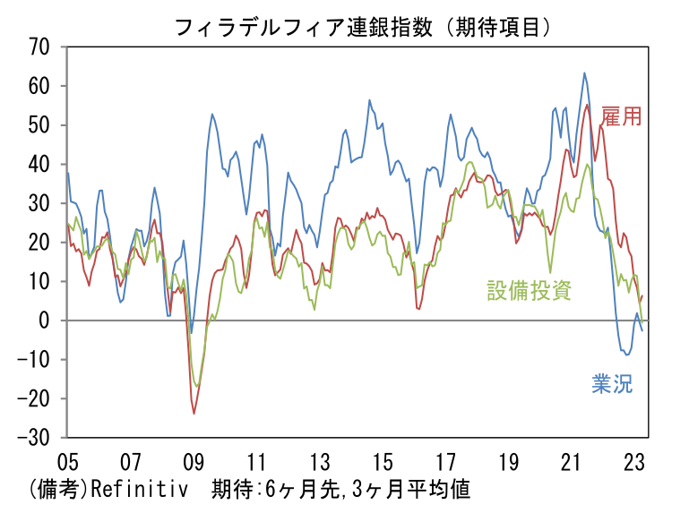 - ISM換算値のヘッドラインを構成する5つの項目は生産(▲25.4→▲7.3)と新規受注(▲28.2→▲22.7)が大幅なマイナス圏から改善した他、雇用(▲10.3→▲0.2)がゼロ近傍まで持ち直した。その他ではサプライヤー納期(▲24.3→▲25.0)が長期化し指数下押しに寄与、在庫(▲11.2→▲17.9)の圧縮は継続した。ヘッドライン構成項目以外では、週平均労働時間(▲22.0→▲8.4)と受注残(▲21.3→▲11.1)の減少が継続。3月対比で多くの項目が僅かに改善したものの、製造業の業況が厳しいことに変わりはない。そうした中、6ヶ月先の予想を問う項目は業況(▲8.0→▲1.5)と設備投資(▲3.8→▲5.4)の弱さが続き、雇用(+6.9→+3.8)も低下した(グラフは3ヶ月平均値)。現況の悪化も然ることながら将来見通しの垂直的悪化は景気後退懸念(ハードランディング)を高める。