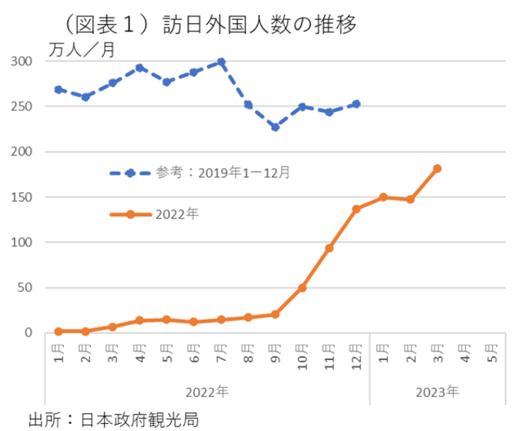 2023年の景気情勢で上振れ要因として、訪日外国人の消費拡大がある。すでに2023年3月まで実績が発表されている。日本政府観光局によれば、2023年3月の訪日客数は、181.8万人とコロナ前の2019年3月の276万人の65.8%(▲34.2%)まで戻している(図表1)。前年比があと34.2%分ほど戻せば、コロナ前のペースを回復できる勢いである。しかも、これを金額ベースでみれば、2023年1-3月の消費額(1次速報)では、10,146億円と、2019年(11,517億円)比で88.1%(▲11.9%)まで戻していることになる。