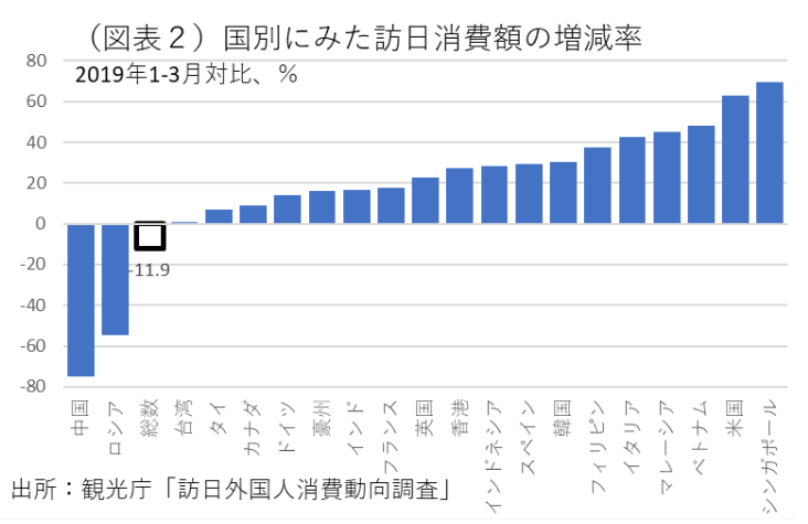 注目すべきは、その内訳である。まず、国別の訪日客数は、ロシアと中国(除く香港)が2019年1-3月比でそれぞれ▲72.9%、▲93.4%と著しいマイナスである以外は、香港が同▲17.6%、台湾同▲33.9%、韓国同▲23.1%とマイナス幅は小さい。ベトナム同31.3%、シンガポール同15.2%、米国同1.5%のようにプラスの国々もある。要するに、特に中国が大きく押し下げていて、それを除くと▲21.0%にマイナス幅は縮小する。