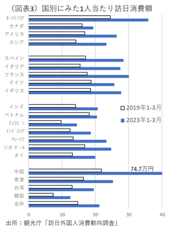 これを金額ベースでみると、2023年1-3月は▲11.9%(2019年1-3月比)と小幅のマイナスになっている。驚くことにロシアと中国以外の主要18か国(観光庁資料の掲示国)はすべて2019年1-3月比でプラスになっている(図表2)。中国が▲74.8%、ロシアが▲54.6%である。ロシア・中国を除いた訪日消費額は、2023年1-3月は、9,062億円と2019年1-3月比で25.1%とすでに大きく増加している。