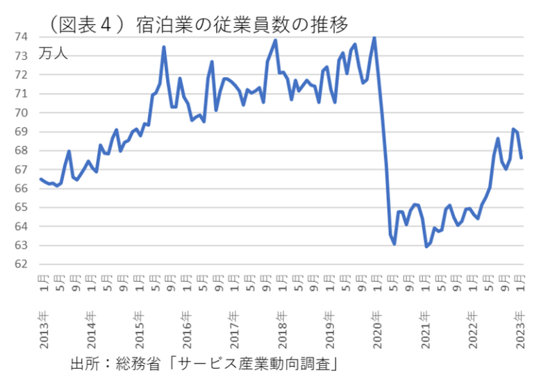 そのときには、宿泊業の就業者数も大きく増加することが見込まれる。総務省「サービス産業動向調査」では、2019年度(期中平均)の宿泊業の従業員数が73.5万人だったのが、2022年初は63万人にまで減っていた。直近2023年2月では67.1万人と、宿泊業ではまだ十分には従業員数の復元ができていない(図表4)。今後は、賃金水準を引き上げながらでも、宿泊業の雇用拡大が進んでいくことが展望できる。