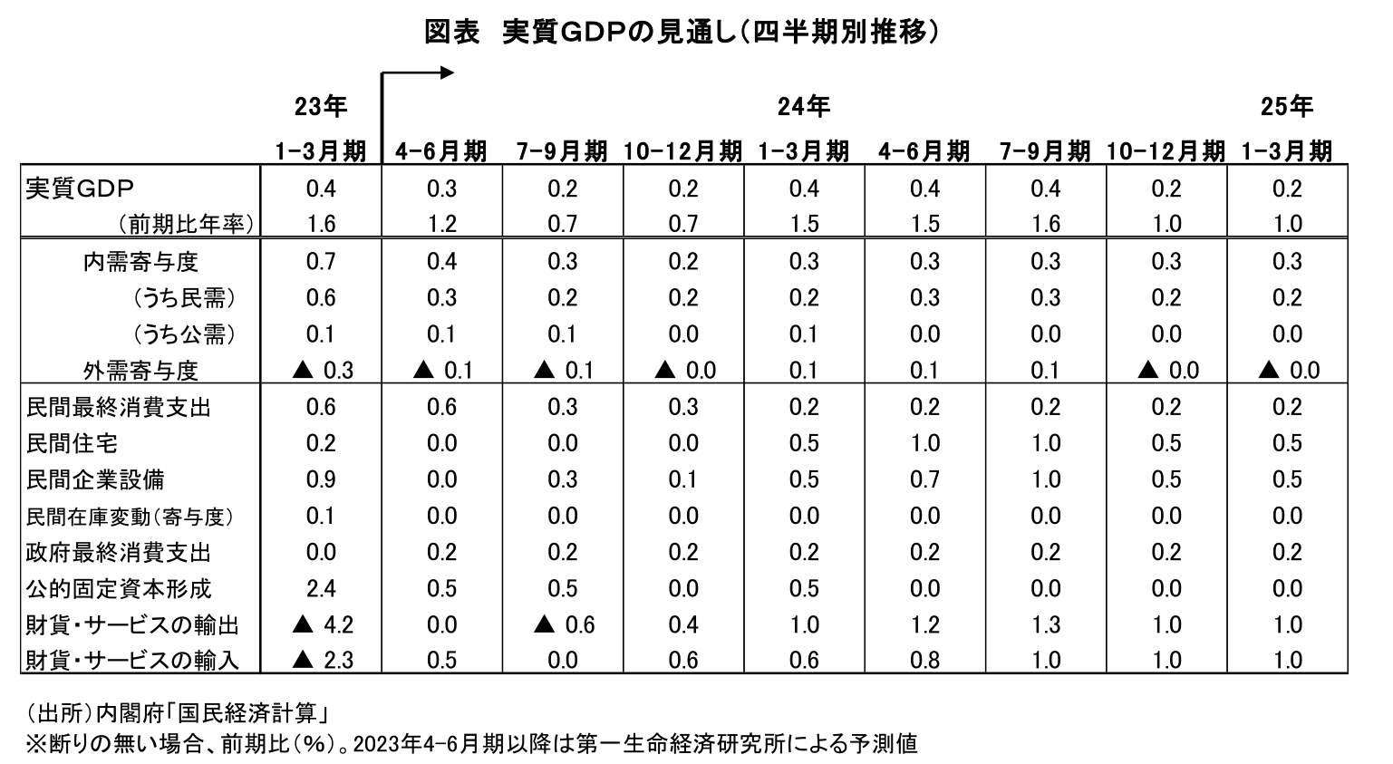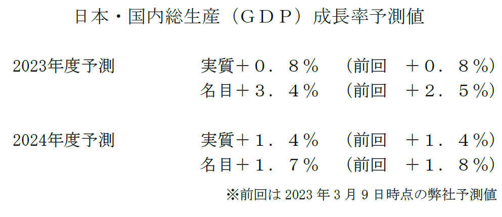 実質GDP成長率の見通しは、23年度が+0.8%(23年3月時点予測:+0.8%)、24年度が+1.4%(同+1.4%)である。暦年では2023年が+0.9%(同+0.7%)、2024年が+1.3%(同+1.4%)となる。