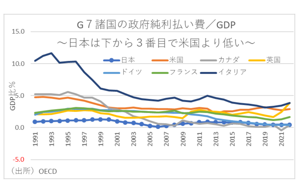 事実、G7諸国の『政府純利払い費/GDP』を比較すると、OECDの2022年見通しベースで日本はカナダ、ドイツに次ぐ三番目に低い水準であり、一方の英国はイタリアに次いで2番目に高い水準にある。
