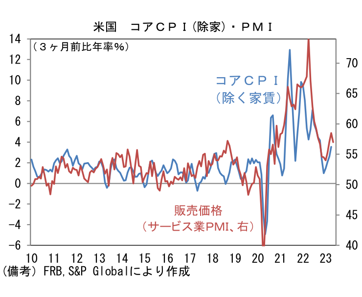 製造業PMIは4月までの改善が一服し再び分岐点割れとなった。生産(52.4→51.0)と新規受注(50.2→47.1)が低下した一方、雇用(53.4→53.5)は概ね横ばい。購買品在庫(48.7→46.4)は減少、サプライヤー納期(43.4→41.6)は短縮し、それぞれヘッドライン下押しに寄与。短期的な生産活動の先行きを読む上で有用な新規受注・在庫バランスは悪化に転じた。この方向感はISM製造業景況指数とやや異なるが、いずれにせよ米国の製造業が勢いを欠いている。他方、サービス業PMIは2022年12月の44.7を底とする鋭い回復傾向にある。金融引き締めによる景気下押し効果が重く圧し掛かるとはいえ、インフレの混乱を上手くかわしている様子が窺える。インフレ動向を推し量るためにサービス業の販売価格に注目すると、現在の57.0という数値は2019年平均値である51.3をなお凌駕するものの、それでも2022年に記録した70超の異常値的水準からは明確に低下している。この指標が家賃を除いたコアCPIと一定の連動性を有していることに鑑みれば、今後インフレ率は鈍化傾向を辿ると予想される。Fedは6月FOMCで利上げの(一時)停止を決定するだろう。