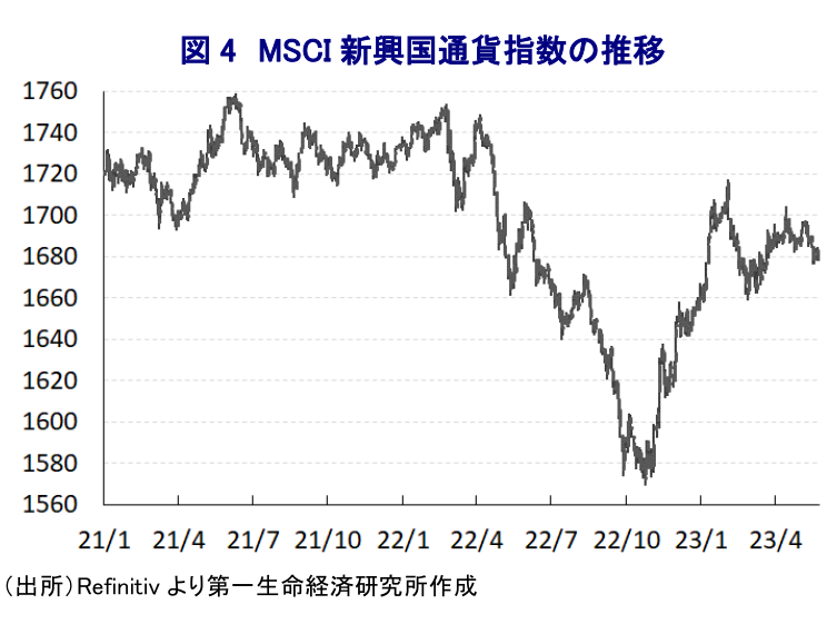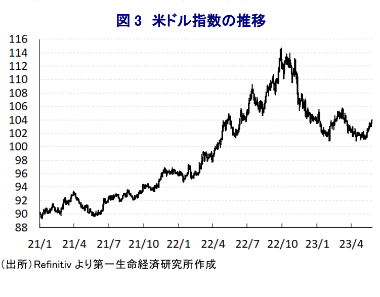 - 昨年末以降は米FRBなどがタカ派姿勢を後退させたほか、米国での銀行破たんを機にした金融市場の不透明感を理由に利上げ局面の休止が意識され、米ドル高の動きに一服感が出ている。結果、マネーフローも変化して一部の新興国では資金回帰の動きがみられる。ただし、世界経済の減速懸念やインフレ後退にも拘らず、米FRBの高金利政策を理由に各国は金融緩和に動けない状況が続く。また、新興国には国際金融市場の動揺への耐性が充分でない国もあり、低所得国などを取り巻く状況は依然厳しいと捉えられる。