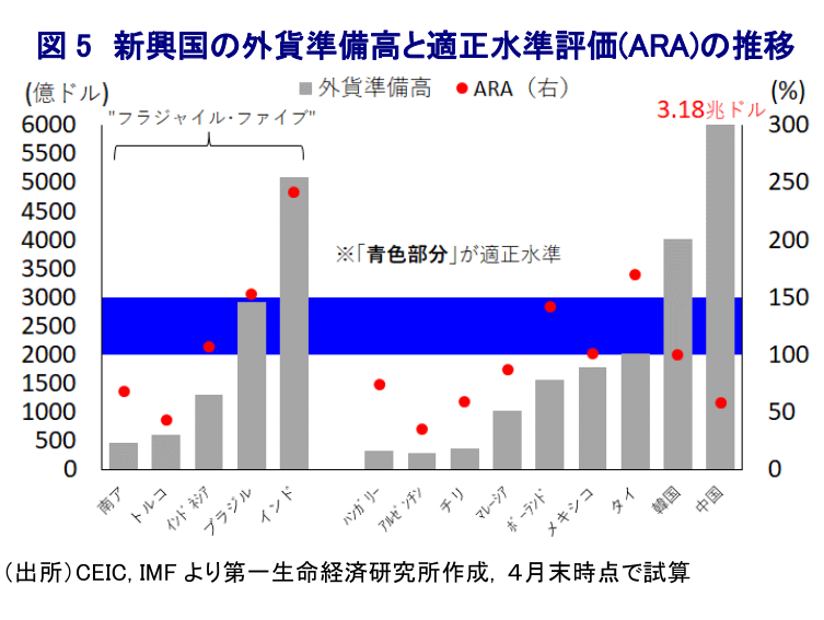 昨年末以降は米国において昂進したインフレが鈍化していることに加え、世界経済の減速懸念が高まるなかで米FRBなど主要国中銀がタカ派姿勢を後退させたことも重なり、米ドル高の動きは一変するなど世界的なマネーフローの動きも変化しているとみられる。さらに、足下では米FRBのタカ派傾斜による急激な利上げ実施を理由に、米国において中堅銀行の破たんが相次ぐなど金融市場に不透明感がくすぶっており、先行きは米FRBが利上げ局面の停止に動くとの見方が強まっており、そうした見方も米ドル高圧力の後退に繋がっている。このように国際金融市場を取り巻く環境が変化していることを受けて、米ドル高による自国通貨安が債務負担の増大を招いた状況は大きく後退していると捉えられる。また、一部の新興国においては物価と為替の安定を目的に断続的、且つ大幅利上げを余儀なくされたことで政策金利は久々の高水準となる一方、世界経済の減速懸念を受けた商品市況の上振れの動きが一巡したことでインフレ率は鈍化しており、結果的に実質金利が上昇する動きがみられる。さらに、主要国中銀のバランスシート規模は昨年初めをピークに頭打ちの動きを強めたものの、歴史的にみれば依然として高水準で推移するなどカネ余りが意識されやすい状況は変わらず、投資家にとってもより高い収益を得たいとの誘因も変わっていない。そうしたなかで投資妙味が相対的に高い新興国では投資資金が回帰する動きが出ており、そうした動きを反映して米ドル相場の上値を抑えているとみられる。しかし、一部の新興国で投資妙味が相対的に高まる動きがみられる一方、投資妙味が低い新興国では資金回帰の動きは弱く、昨年末以降の新興国通貨に底入れの動きがみられるものの、その水準は依然として昨年初めを下回るなど自国通貨建で換算した債務負担の増大に繋がりやすい状況は続いている。また、米FRBはタカ派姿勢こそ後退させるも、高金利政策を長期に亘って維持すると見込まれるなか、仮に新興国においてインフレ鈍化や景気減速懸念への対応を理由に利下げに動けば資金流出の動きを惹起させる可能性はくすぶる。よって、新興国にとっては自国の物価や金利動向に関係なく高金利政策を維持せざるを得ない状況が続いており、金利負担と債務負担の増大が対外債務を巡るリスク要因となる環境は変わっていない。さらに、上述のように米国での銀行破たんをきっかけにした金融市場を巡る不透明感に加え、足下の世界経済は米中摩擦やウクライナ問題を巡る各国の対応をきっかけに『分断』が広がるとともに、サプライチェーンの再構築の動きなど世界貿易の萎縮に繋がる動きが広がりをみせるなど、景気の足を引っ張る要因は山積している。その意味では、国際金融市場に動揺が広がるリスクはくすぶるとともに、新興国のなかには外貨準備高が金融市場の動揺への耐性が充分ではない国もあり、これらの国以外の低所得国や中所得国を取り巻く状況は一段と厳しいものとなる可能性はくすぶっていると捉えられる。