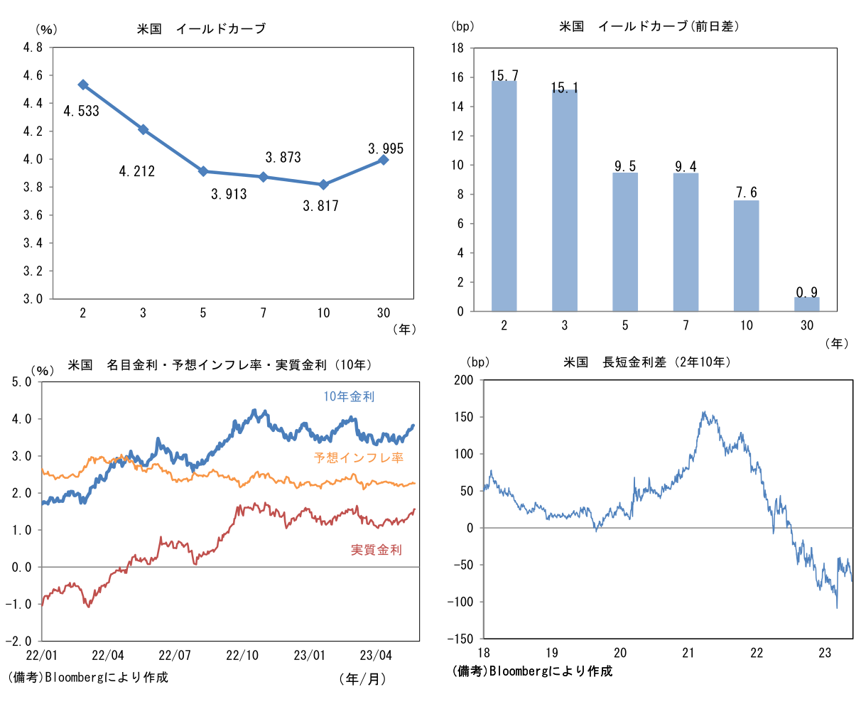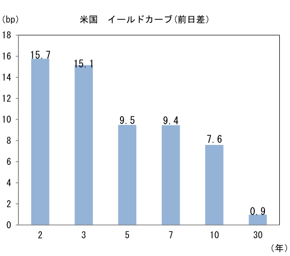 - 米金利はベア・フラット化傾向。予想インフレ率(10年BEI)は2.261%(▲0.2bp)へと低下。実質金利は1.565%(+7.9bp)へと上昇。長短金利差(2年10年)は▲71.8bpへとマイナス幅拡大。