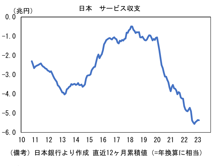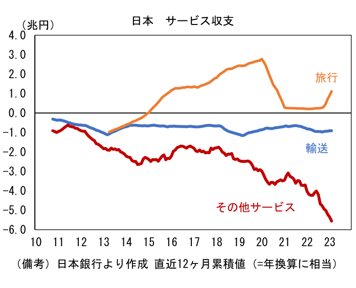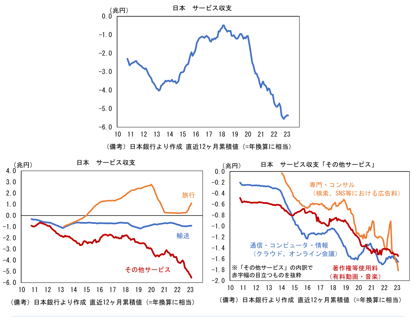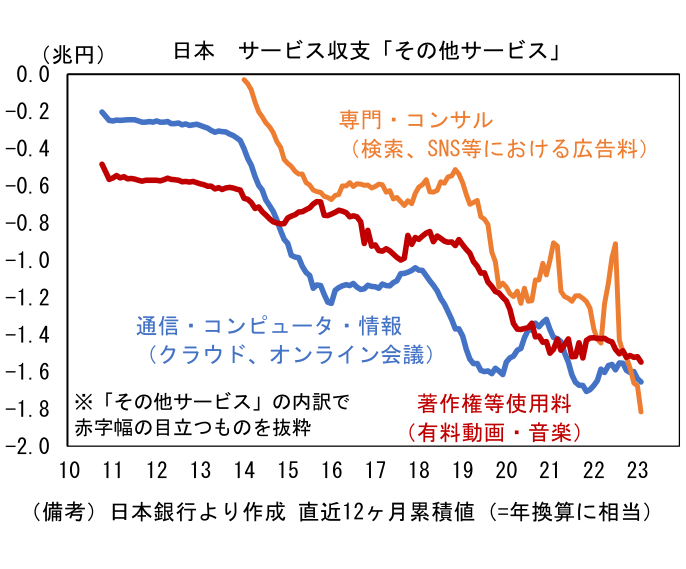 日本のサービス収支は1996年の現行国際収支統計の集計開始以降、一貫して赤字を計上してきた。2020年以降は旅行収支の黒字幅縮小が痛手となり年間6兆円に迫るペースで赤字を計上している。では、仮に旅行収支が2019年水準へと戻れば、サービス収支が当時の水準に回帰できるかと言えば、その可能性は低い。その理由として、ここ数年デジタル関連支出が急速に増加し「その他サービス収支」の赤字幅が拡大していることがある。その他サービス収支の内訳で赤字幅が大きいのは「専門・経営コンサルティングサービス」、「コンピューターサービス」、「著作権使用料」であり、日銀によるとこれら3項目にはクラウドサービス、オンライン会議、検索サイトやSNS(および無料動画サイト)への広告料、有料動画、音楽配信サービスなどが含まれるという。主として米テック企業が提供するこれらサービスは、今や国民生活に広く浸透しておりこの3項目だけで年間5兆円を超す赤字となっている。円安が進行すると、これらの支払いに対する負担が増し、国民所得が棄損する恐れがある(同時にこれらの支払いに伴うドル買い需要が円安を促すという視点もある)。