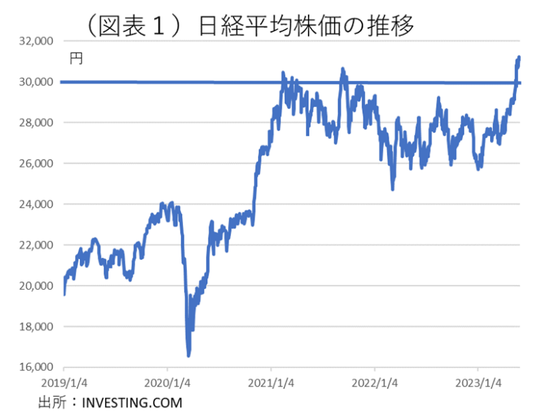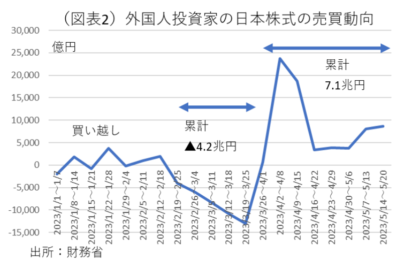 日経平均株価が2021年以来の3万円台になって、しばらく時間が経つ(図表1)。果たして、この株価3万円台は今後もずっと維持可能なものなのだろうか。株価が急上昇したのは、4月末から5月中旬にかけてである。しばしば言われるのは、外国人投資家の日本株買いである。5月中旬まで8週間連続での買い越しだと説明される。しかし、外国人投資家が、「なぜ、ここにきて日本株の購入を増やしたのか?」という理由を考える方が重要だ。神は細部に宿る。財務省の週次の対内証券投資データ(対外及び対内証券売買契約等の状況)からは様々なことが推察される。8週連続の買い越しの前に、5週間連続の売り越しがあったことがわかる。2月19日~3月25日は何と▲4.2兆円の売り越しだった。それが裏返るように、3月26日~5月20日は+7.1兆円の買い越しになった(図表2)。この資金フローは、日銀の政策評価と連動したものだと推察される。2月10日に植田総裁の名前が浮上した直後から、金融市場では日銀が金利正常化に動くとの観測が高まった。そのタイミングでは、外国人投資家が日本株を売っていた。その後、3月上旬に米銀不安が起こると、植田総裁はみるみる消極的に変わった。それを見透かしたかのように、外国人投資家は3月末から日本株を買い戻す。4月末の決定会合で、マイナス金利解消に向けた利上げも、長期金利変動幅の上限引き上げも遙かに遠のき、一気に安心感が広がった。外国人投資家は、5週連続の売りから8週連続の買いに転じる。株価3万円の隠れた立役者が日銀だったことがわかる。