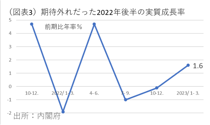 外国人投資家にとっても、2022年後半の日本経済は、期待外れの成長率だったはずだ。2023年1-3月に前期比が1.6%になったとはいえ、まだ2023年4-6月以降の見通しは年率1%台の小幅な成長率である。「ここにきて外国人投資家が日本経済を高く評価し始めた」という見方はあまり支持できない。