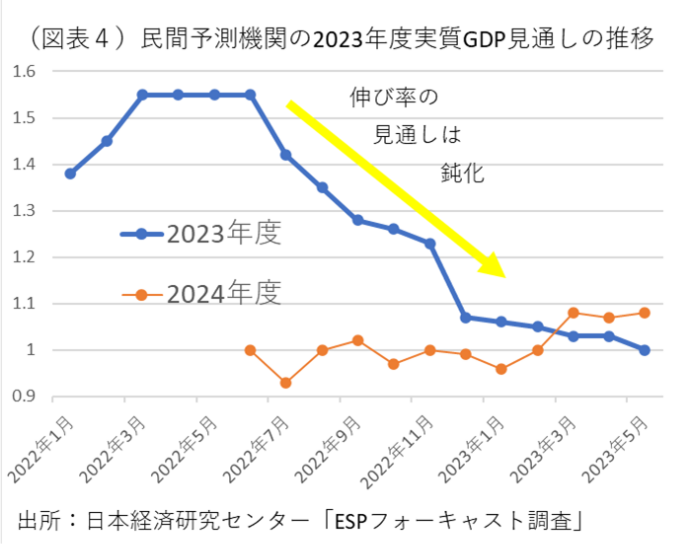 この期待感を数字で分析してみよう。従来、少なくとも2022年後半の経済成長は「期待外れ」だった(図表3)。GDPの実績は、2022年7-9月(前期比▲1.0%)と10-12月(同▲0.1%)がマイナス成長だった。その前のGDPは、2022年4-6月のリバウンド(前期比4.7%)が大きかったが、高成長は続かなかったということになる。日経センターのESPフォーキャスト調査でみても、2022年春から夏にかけては、2023年度成長見通しが強気だった。その頃は、2023年度1.55%という伸びだった。しかし、見通しはそこからピークアウトする。最近の2023年5月は、1.00%と低調になっている(図表4)。