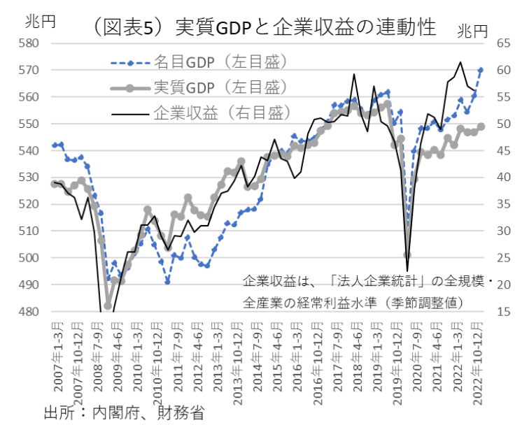 なお、このGDP指標と企業収益の間には、微妙な連動関係がある。実質GDPの季節調整値は、名目GDP以上に、企業収益(法人企業統計「経常利益」(季節調整値))と連動している(図表5)。マクロの企業収益は、意外にGDP統計と強く連動している。だから、企業収益の先行指標として、投資家が日本の成長率に注目するとしても、それは不思議なことではない。