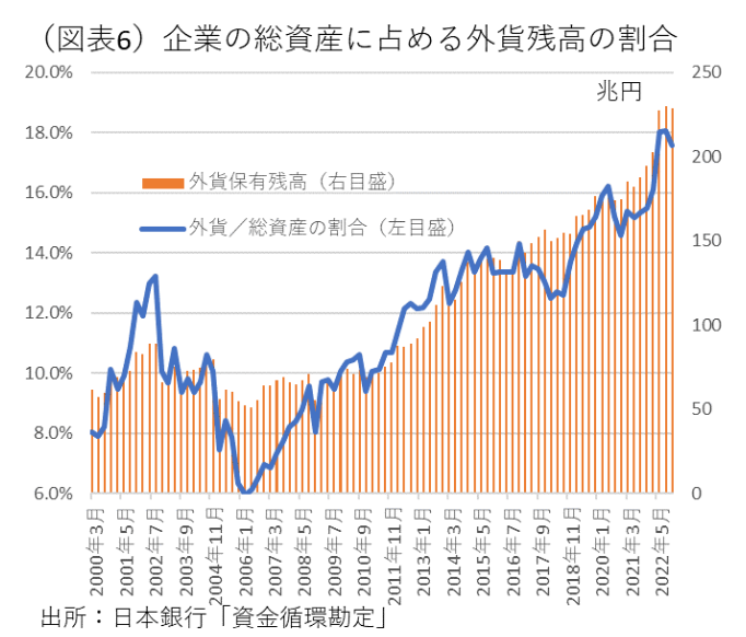 日銀の「資金循環勘定」で、外貨資産残高(外貨預金+対外証券投資+対外直接投資+その他債権)の推移を調べると、過去10年間で巨大化していた(図表6)。2012年末91.8兆円から2022年12月末228.8兆円と2.6倍に増えた。事業法人のバランスシートの約18%が外貨資産である。円安が10%進めば、計算上では企業資産は+23兆円も増えることになる。2022年3月くらいから円安が急激に進んで、現在まで外貨資産残高の評価額を膨らませている。おそらく、外貨資産から得られるフローの外貨の円評価額も大きくなっているはずだ。これは見かけ上だと言ってしまえばそれまでだが、企業の資産残高の数字を押し上げる効果を持っている。