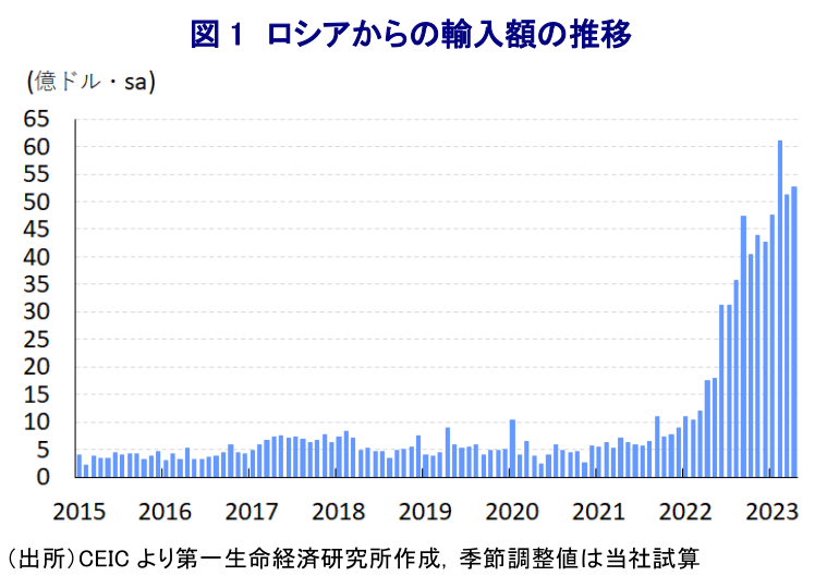 インドを巡っては、近年の高い経済成長も追い風に昨年のGDPは米ドルベースで旧宗主国である英国を上回り、米国、中国、日本、ドイツに次ぐ世界5位の水準となるなど、世界経済における存在感を着実に高めている。さらに、今年の同国はG20(主要20ヶ国・地域)の議長国となるなか、1月にはグローバルサウス(南半球を中心とする新興国・途上国)の声サミットをオンラインで主催するなど、主要国と途上国の『橋渡し』を担うことでその盟主を狙う動きをみせるなど、国際政治の舞台においても存在感を高めている。そして、長年に亘る一人っ子政策の影響やコロナ禍も重なり中国が人口減少に転じる一方、インドの人口は年内にも世界1位になるとともに中長期的にも増加が見込まれるなど、人口増加を追い風にインドの存在感が益々高まるとの期待もある。そうした期待の一部はインドが中国に代わって世界経済の『けん引役』になるとの見方に繋がっているとみられるものの、現実には依然としてそのハードルは高いのが実情である。2014年に発足したモディ政権は『メイク・イン・インディア』などのスローガンを掲げるとともに、製造業振興による経済成長実現に向けて外資誘致の積極化を図る姿勢をみせた。しかし、そのスローガンとは裏腹にGDPに占める製造業比率は高まらずにコロナ禍で反って低下しており、中国のような『世界の工場』として世界経済のけん引役を担うには幾重のハードルを越える必要がある(注1)。また、モディ政権発足後の同国では、政権を支える与党BJP(インド人民党)がヒンドゥー至上主義を党是とするなか、イスラム教徒を中心とする異教徒に対する『迫害』とも取れる動きを強める傾向がうかがわれる(注2)。そして、同国は伝統的にロシアと友好関係を有するなか、昨年来のウクライナ情勢の悪化に際しては表面的にロシアによるウクライナ侵攻を批判する一方、国内で消費する原油の大宗を輸入に依存するなかでロシアからの原油輸入を急拡大させており、実質的にロシアを支援する格好となっている。なお、インドがロシア産原油の輸入を急拡大させている背景には、ウクライナ情勢の悪化による欧米などの対ロ制裁強化を受けて国際価格が上昇してインフレ圧力が強まるなか、割安なロシア産原油の調達を拡大させることでインフレ圧力の緩和を図りたいとの思惑が影響している。さらに、同国は慢性的に経常赤字と財政赤字の『双子の赤字』を抱えるなか、インフレが重なることで経済のファンダメンタルズ(基礎的条件)の脆弱性が増すことは国際金融市場を取り巻く環境変化への耐性を低下させるリスクを孕んでいる。事実、昨年来の国際金融市場における米ドル高局面においては、通貨ルピーの対ドル相場が最安値を更新する展開となり、輸入インフレが懸念される状況に見舞われた。こうした状況を勘案すれば、インドが採る自身の『国益』を主眼に置いた外交戦略も致し方ない面があるのは理解出来る。他方、多くの途上国が異なる思惑を持つなかでグローバルサウスとひとまとめにすることは些か乱暴な上、新興国のなかにはインドが隠さない『盟主面』を快く思わない向きもうかがえる。その意味では、インドの動きとその背後にみえる新興国の思惑や動きを冷静にみる必要性が高まっていると判断出来る。
