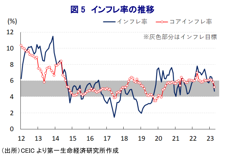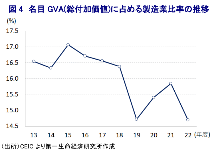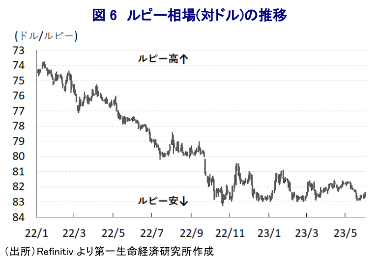 なお、産業別の生産動向を示す実質GVA(総付加価値)成長率については、1-3月は前年同期比+6.5%と前期(同+4.7%(改定値))からGDPと同様に伸びが加速しているほか、前期比年率ベースでも拡大の動きを強めるなど底入れの動きが進んでいる様子が確認されている。分野別では、上述のように外需の底入れが進んでいることを反映して製造業の生産が大きく押し上げられているほか、インフラなど公共投資の進捗を受けて建設業の生産も大きく押し上げられている。また、家計消費など内需は力強さを欠く展開が続くもサービス業の生産は堅調な推移をみせており、これは外国人観光客数の底入れによる観光関連での生産押し上げのほか、国際金融市場における取引活発化を反映して金融関連の生産が押し上げられていることが影響している。こうした状況を勘案すれば、足下における景気底入れの動きは内生的な要因により押し上げられたものとはほど遠いと捉えることが出来る。こうした状況は昨年度のGVAに占める製造業の割合が前年度から再び低下していることにも現れており、経済構造面ではコロナ禍からの景気回復の動きが一巡している上、上述したモディ政権が掲げる一連のスローガンが事実上『掛け声倒れ』に留まっていると考えられる。同国では来年に次期総選挙(連邦議会下院総選挙)が予定されており、モディ政権が2月に公表した今年度予算は総選挙後の3期目入りを盤石にすべく大規模な財政出動による景気下支えを意識した内容となった。こうした状況にも拘らず、次期総選挙の前哨戦として先月に南部カルナタカ州で実施された州議会選では、事前予想を覆す形で選挙前に与党であったBJPが大敗を喫する一方、中央政界で最大野党の国民会議派が単独で半数を上回る議席を獲得した。なお、今年2月に北東部の3州(トリプラ、メガラヤ、ナガランド)で実施された州議会選においては、BJPが事前予想を上回る形で善戦していたため、上述したカルナタカ州での大敗北は議会上院の議席数にも影響を与えるなど次期総選挙に向けた『躓き』になったと捉えられる。一方、上述のように足下のインフレが一段と鈍化していることは実質購買力の押し上げを通じて家計部門を取り巻く環境改善に繋がることが期待される。ただし、足下の国際金融市場においては米ドル高圧力がくすぶるなか、経済のファンダメンタルズの脆弱さを理由にルピー安圧力が掛かりやすい展開が続いており、輸入インフレ圧力が強まる懸念はくすぶる。中銀は4月の定例会合において約1年弱に及んだ利上げ局面の休止に動いたが(注4)、インフレが鈍化の動きを強めていることを勘案すれば一段の利上げに動く必要性は後退していると捉えられる。とはいえ、ルピー安が輸入インフレ懸念に繋がりやすいことを勘案すれば金融緩和に動くハードルは極めて高い。その意味では、当面のインド経済は外部環境に左右されやすい展開が続くであろう。当研究所は先月に今年度の経済成長率見通しを+5.8%としたが(注5)、足下の景気は想定を上回る動きをみせたものの、現時点においてはこれを据え置くこととする。