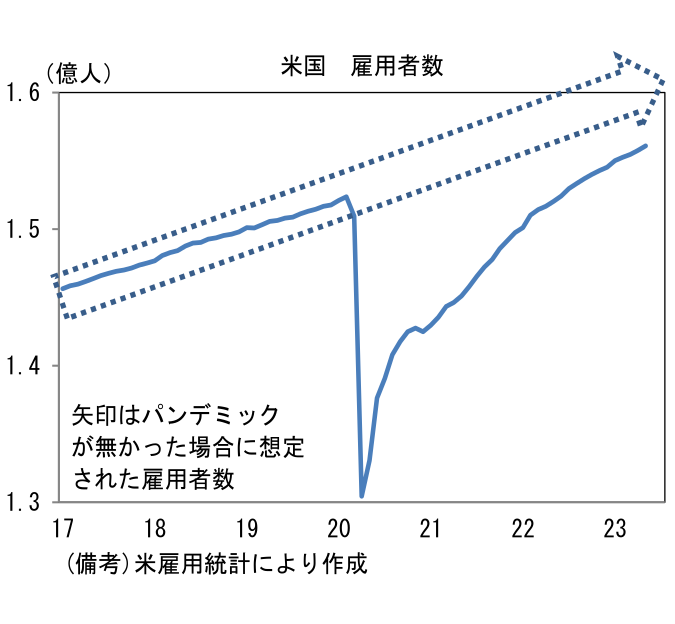 5月米雇用統計によると、雇用者数は前月比+33.9万人と市場予想を上回り、同時に過去2ヶ月分は累積9.3万人分が上方修正され、3ヶ月平均では+28.3万人となった。インフレ影響で企業収益が圧迫される中、新規採用が減少するとの懸念は根強いが、少なくとも5月分においてそれは杞憂に終わっている。業種別にみるとレジャー・ホスピタリティ(宿泊・飲食業、+4.8万人)の増加が持続したほか、教育(+9.7万人)、建設(+2.5万人)、運輸(+2.4万人)などが堅調。政府部門(+5.6万人)の不可解な強さも続いた。2020-22年の大量採用が仇となった情報(▲0.9万人)は減少したが全体への影響は限られる。また製造業(▲0.2万人)も減少した。