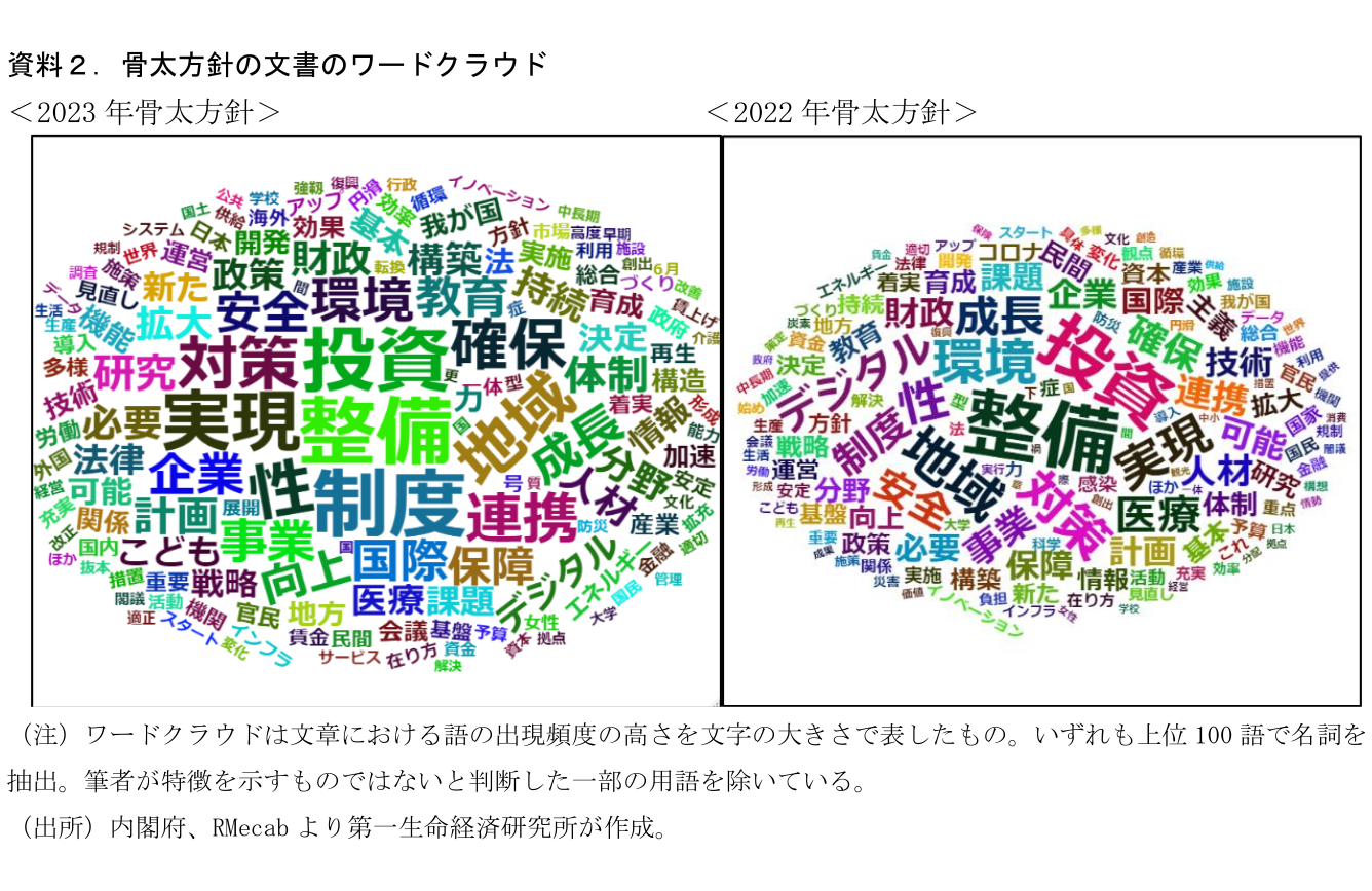 資料2では今回と前回の骨太方針のワードクラウドを掲載した。新しい資本主義では官民一体投資の重視が掲げられており、昨年同様「投資」(22年骨太:104回→23年骨太原案:113回)の出現頻度が多い。また、今回骨太では少子化対策の強化を受けて「こども」(20回→54回)が増加しているほか、労働市場改革などの中で「賃金」(15回→31回)「賃上げ」(10回→25回)が数多く登場していることも昨年と比較した特徴である。コロナ(34回→14回)が減少していることも脱コロナ禍の進行による政策における重要度低下を象徴している。