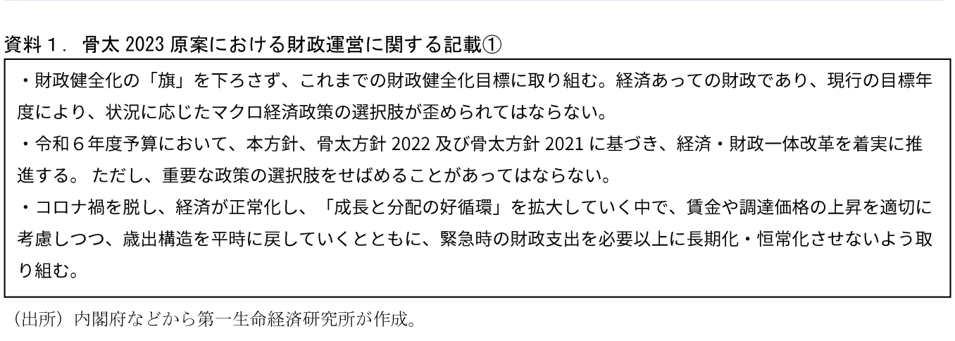 本稿では骨太方針2023の財政目標・財政運営関連の内容についてポイントをまとめる。ポイントは大きく3点で、①既存の財政再建目標を踏襲、②2024年度の点検・検証と“中期的な経済財政の枠組みの検討”、③政府中長期試算における分析の充実、である。特に②が財政再建目標の見直しを示唆するものであり、注目すべき内容といえる。