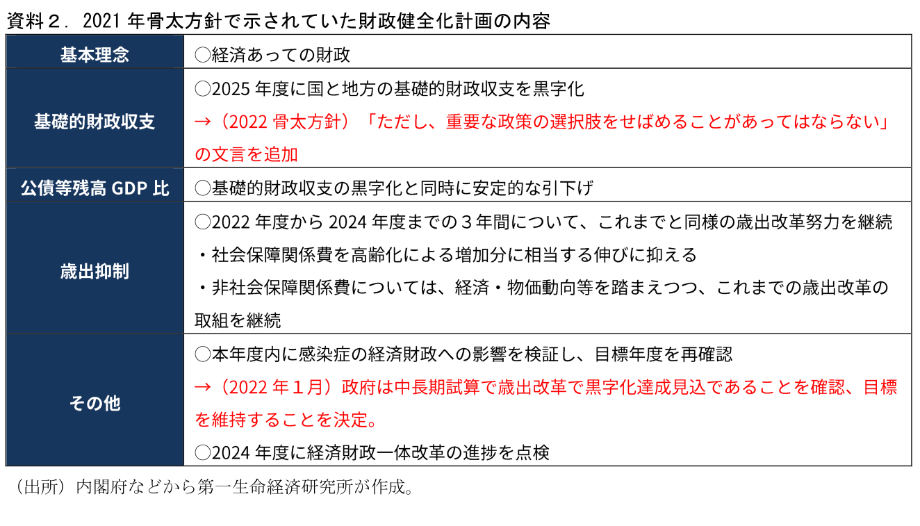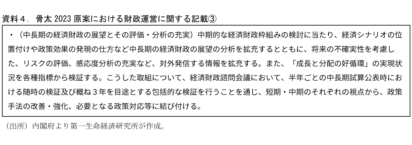 第2のポイントは「中期的な経済財政の枠組みの検討」である。原案には資料3の通り「経済・財政一体改革の進捗について2024年度に点検・検証」するとともに、「中期的な経済財政の枠組みの策定」「経済再生と財政健全化の両立の枠組みなどについて検討を進める」としている。資料2にもあるが、「2024年度の点検」は骨太方針2021で既に示されていたことだ。ここでは2022~24年度の3年間の財政運営方針を定めていた。重要な点はその終了に伴って次の枠組み(≒目標)を定めることが明記されたことだ。