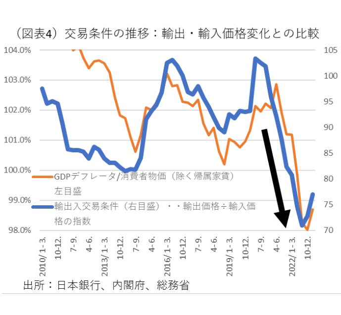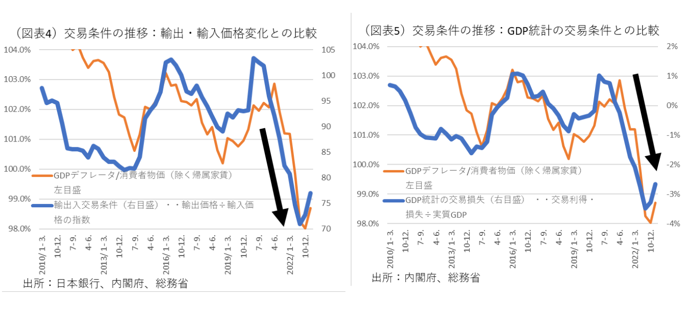 消費者物価の伸び率が高く、GDPデフレータの伸び率が低いとき、交易条件は悪化する。理由は、輸入価格が上がると消費者物価はコストアップで上昇し、GDPデフレータの方はコスト転嫁ができずに下がるからだと説明される。デフレータは需要本位の価格指標なので、コストアップを価格転嫁ができず、需要が下がって価格下落と計測される。