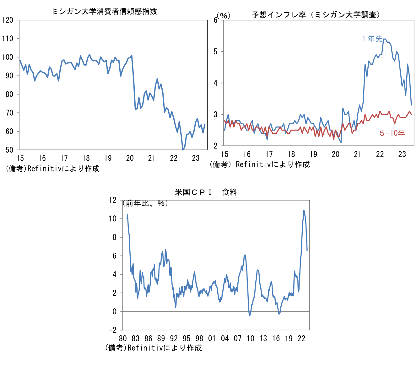 - またここへ来て予想インフレ率低下という更なる追い風が吹いてきた。6月16日に発表された6月のミシガン大学消費者信頼感指数はヘッドラインの景況感が改善すると共に予想インフレ率の低下が確認できた。1年先の予想インフレ率はガソリン価格下落が一服する中にもかかわらず3.0%へと低下。生活に身近な「卵」の価格下落などから食料品が前年比+6.6%(CPIベース)へと減速し、消費者の体感物価を引き下げた可能性が指摘できる。また5-10年先は3.0%へと0.1pt低下。こちらはレンジ内の推移であるが、それでもFedの懸念を高めるものではないだろう。