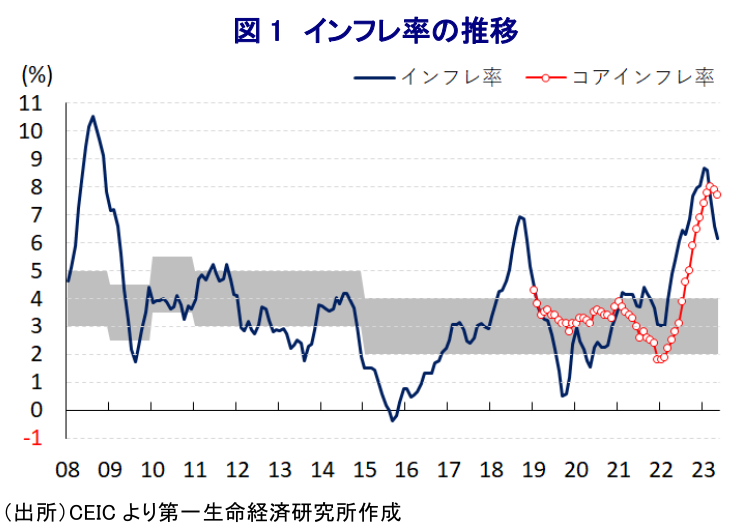 フィリピン経済を巡っては、昨年は感染一服による経済活動の正常化に加え、欧米など主要国を中心とする世界経済の回復が外需を押し上げるとともに、移民送金の堅調な流入も重なり久々の高成長を実現した。なお、同国は財輸出の約3割、コロナ禍前においては外国人観光客の2割強を中国(含、香港・マカオ)が占めるなど、中国によるゼロコロナ終了の動きは景気の追い風になることが期待された。しかし、足下の中国経済は早くも『息切れ』が意識される状況が続いている上、欧米など主要国も物価高と金利高の共存が長期化するなかで頭打ちの様相を強めるなど外需を取り巻く環境は厳しさを増している。他方、昨年来の商品高の動きに加え、国際金融市場における米ドル高を受けた通貨ペソ安が輸入インフレを招くとともに、景気回復の動きも重なりインフレ率は大きく上振れする事態に直面した。これを受けて、中銀は昨年5月に利上げ実施に舵を切るとともに、その後も物価と為替の安定を目的に断続、且つ大幅利上げを余儀なくされるなど難しい対応を迫られた。結果、同国においても物価高と金利高が共存するなど景気に冷や水を浴びせる懸念が高まり、今年1-3月の実質GDP成長率は伸びが鈍化するなど足下の景気は頭打ちの様相を強めている(注1)。他方、インフレ率は年明け直後に一時14年強ぶりの高水準に加速したものの、昨年末以降は商品高の動きに一服感が出るとともに、米ドルの動きが一巡しているほか、足下では世界経済の減速懸念を背景に商品市況も調整の動きを強めるなど、インフレ圧力の後退に繋がる動きがみられる。結果、その後のインフレ率は昨年に急上昇した反動も重なり頭打ちの動きを強めており、こうした動きを好感して中銀は5月の定例会合において10会合ぶりに政策金利を据え置く決定を行うなど、約1年に及んだ利上げ局面の休止に動いている(注2)。さらに、直近5月のインフレ率は前年比+6.1%と前月(同+6.6%)から一段と鈍化して11ヶ月ぶりの伸びとなっている一方、コアインフレ率は同+7.7%と前月(同+7.9%)から鈍化こそすれ、依然として中銀のインフレ目標(2~4%)を大きく上回る推移が続くなど、インフレ収束にはほど遠い状況が続いている。さらに、年明け直後にかけてのペソ相場は米ドル高の一服も重なり底打ちしたものの、足下においては米FRB(連邦準備制度理事会)の政策運営に対する不透明感が相場の重石となる展開が続くなど、輸入インフレ圧力がくすぶる状況にある。また、上述のように足下の景気は内・外需双方で頭打ちする動きがみられ、インフレ鈍化により実質購買力が押し上げられるなど内需を取り巻く環境変化に繋がることが期待されるなか、中銀が利上げを回避することで景気下支えに注力したいとの思惑を強めていると捉えられる。こうしたなか、中銀は22日の定例会合においても政策金利である翌日物リバースレポ金利を2会合連続で6.25%に据え置く決定を行っている。会合後に公表した声明文では、先行きの物価動向について「最新の見通しでは目標域への緩やかな回帰が見込まれる」とした上で、インフレ見通しを「今年は+5.4%、来年は+2.9%」と従来見通し(今年は+5.5%、来年は+2.8%)から短期的に下方修正している。その上で、「経済活動は緩やかであり、景気のモメンタムは横這いとなる見通し」であるとしつつ、「インフレ見通しを巡るリスクは上向きに傾いている」との認識を示した上で「必要に応じて再利上げに動く用意はある」と前回同様に再利上げに含みを持たせる姿勢をみせている。他方、物価動向について同行のメダラ総裁は「インフレ率は10月か11月には4%以下に低下し、コアインフレ率もこれに追随すると見込まれる」とした上で、「個人的には米FRBがこれまで行ってきたような事態に直面することはなく、金利水準はインフレ動向に従って決まる」と述べるなど、これまでに比べて楽観的な姿勢に傾いている様子もうかがえる。その上で、「極めて近い将来に利下げに動くことはない」としつつ、「利下げ実施には少なくともインフレ率が2ヵ月連続で4%を下回る状況を確認したい」と述べるなど将来的な利下げの可能性に言及するなど『ハト派』姿勢を強めている。ただし、「政策金利は物価動向によって規定されると考えるが、仮に米FRBが50bpの利上げに動けば対応せざるを得ないだろう」と述べるなど、あくまで外部環境次第とする考えもにじませている。こうした状況は利上げ局面の終了を示唆しているとみられる一方、コアインフレの収束には相当時間を要する可能性も燻ぶるほか、ペソ相場の動向など外部環境如何では再利上げに追い込まれる可能性は残る。よって、今後の政策運営はこれまで以上に難しい対応を求められる局面が続こう。