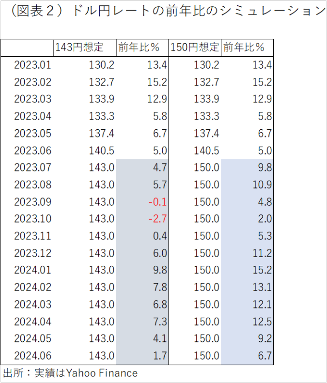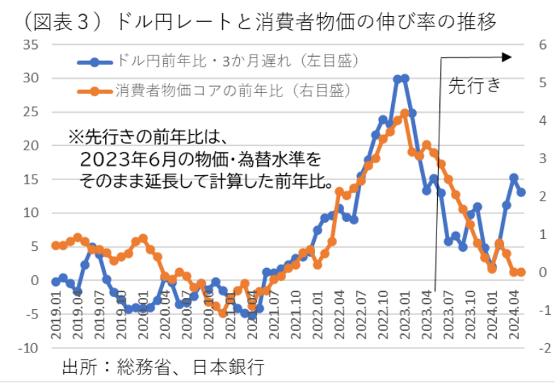 仮に、今後、円安が進めば、それは物価をどのくらい押し上げるのだろうか。仮に、ドル円レートが1ドル143円で7~12月に推移した場合、7・8月の前年比は4~6%程度、その後9~10月は前年比▲3~0%に低下する。そして、12~来年4月までは前年比6~10%になる計算だ(図表2)。さらに、1ドル150円であれば、9~11月の前年比マイナスもなくなる。これは、円安シナリオが、日銀の物価見通しを著しく修正させることを意味する。消費者物価コアの前年比とドル円の前年比は、3か月間のタイムラグを伴って、2019~2023年にかけてかなりピッタリと一致して動いている(図表3)。年内150円台前半に向かっていく場合に、消費者物価コアの見通しが大きく修正を余儀なくされる可能性がある。