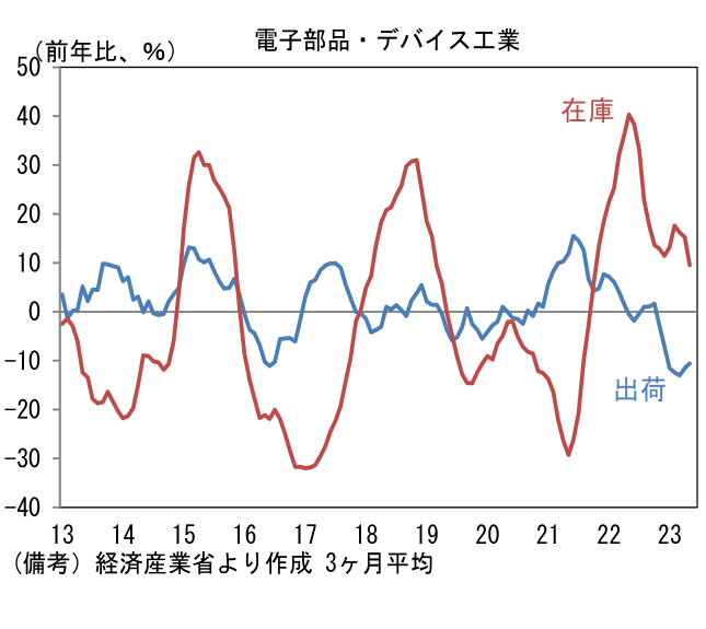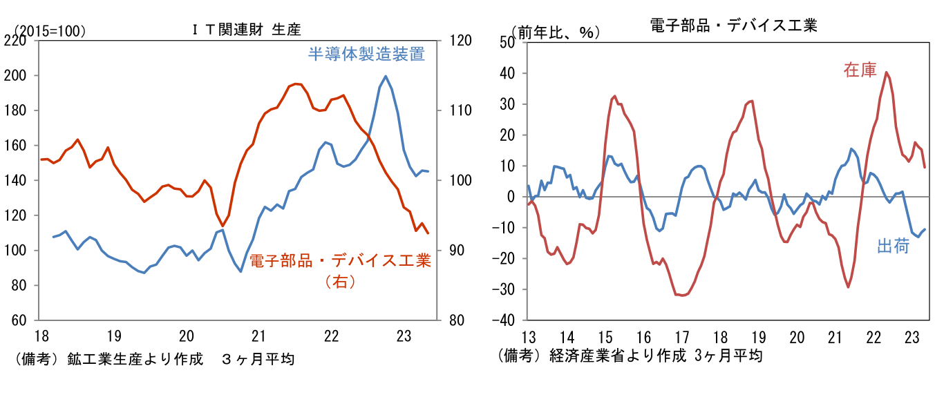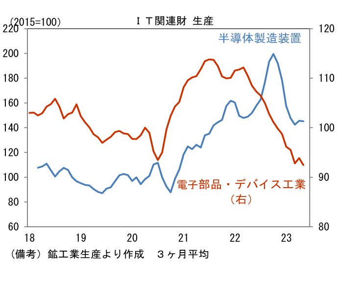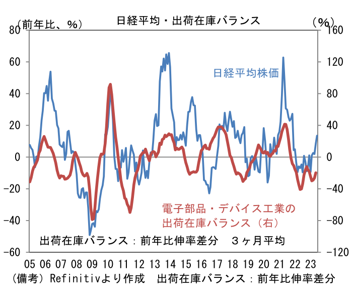 - 長期的に電子部品・デバイス工業の出荷・在庫バランスと日経平均株価は連動性を有してきた。2月データは2022年4-6月期をボトムとする出荷・在庫バランスの改善が頓挫し復活までに相応の時間を要すことを示唆したが、3月以降のデータはそうした懸念を和らげている。これまで筆者が当レポートで繰り返し言及してきた「業績反転を先取りするという視点で、その時機が近づいているようにも見える」との見方は5~6月の株式市場で現実のものになった。直近の株価急上昇はやや楽観的に映るが、今後は生成AI関連の投資にも刺激され、IT関連財のサイクルは上向きに転じると期待される。